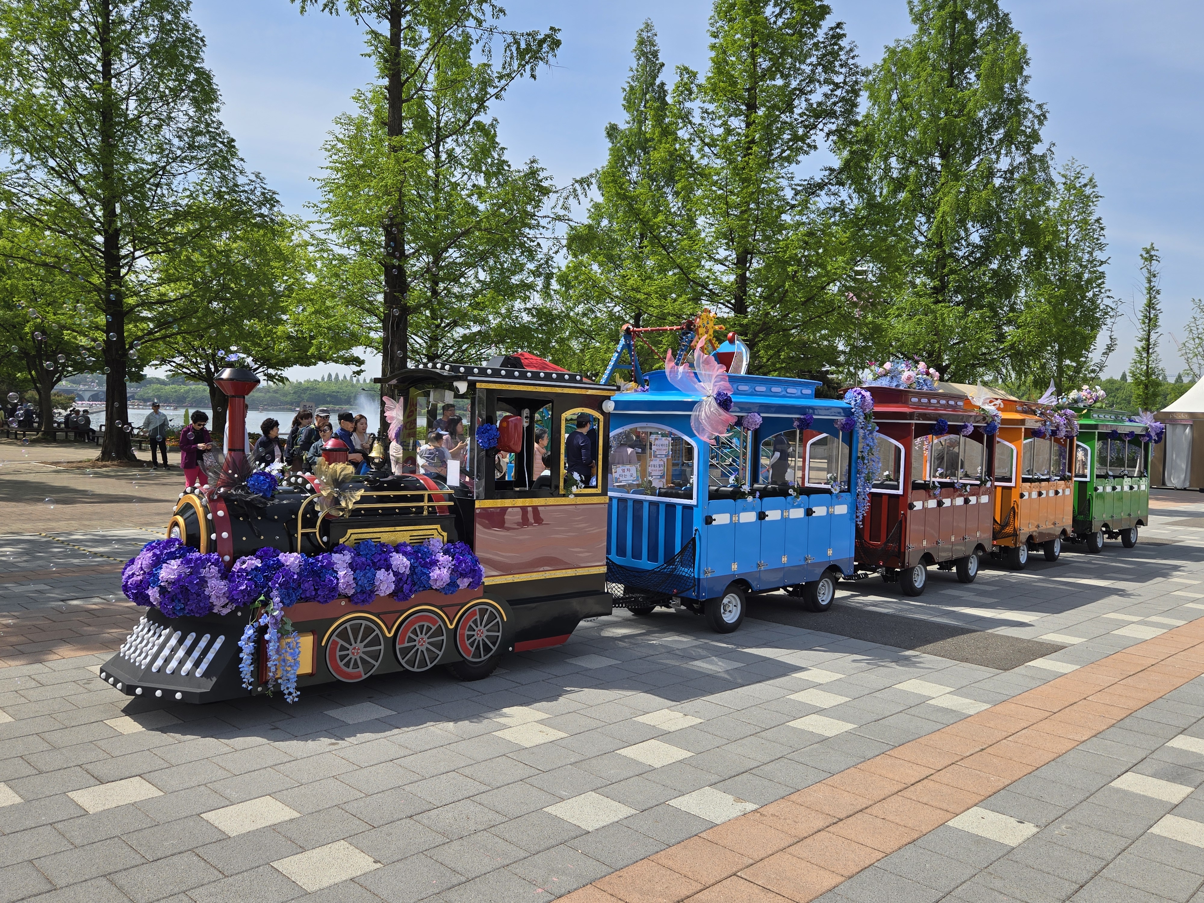 실외전시관 출구로 나서면 탁트인 호수를 배경으로 카페거리가 조성되어 있고, 아이들을 위한 바이킹 그네와 기차가 있다.